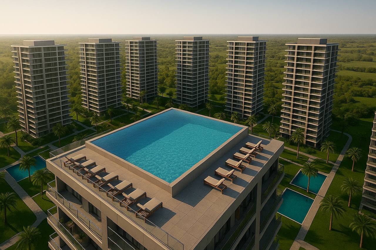 Yüzme havuzları, güneşlenme alanları ve yeşil çevresiyle tam bir yaşam alanı.